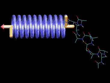 spring 1.0 ---------- REQUIREMENTS: VMD Version 1.1 or greater, use in orthographic mode DESCRIPTION: After an atom has been picked, call "spring". It generates a a mechanical spring from the location of the atom outward toward the eye position. By default the spring has a radius of 3 A and a length of 20 Angstroms. These and other parameters can be altered in well-labelled parts of the procedure if desired. This script is useful to those who do simulated micromanipulation experiments. It comes in handy when explaining the method by which parts of the protein were pulled. PROCEDURES: spring - be sure to pick an atom before calling this EXAMPLE OUTPUTSample showing a spring added to an atom of the alanin molecule. This image has been rotated by 90 degrees to make the spring fully visible. DOWNLOAD THE FILE: spring.tcl AUTHOR: Willy Wriggers (wriggers@ks.uiuc.edu)