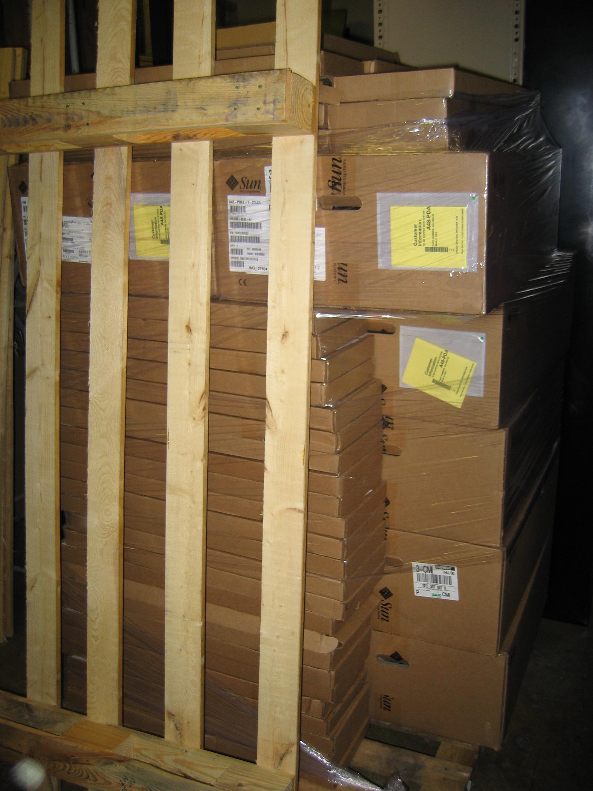 Having determined that the loading dock didn't have enough space, we spent the next few days trying to find some solutions to this problem. Step one: move things to storage and start working on a test cluster. Step two: start assembling in what space we might have, using the lessons of step one. And so by the end of 11 May 2004, we had a full five systems mounted in the rack.