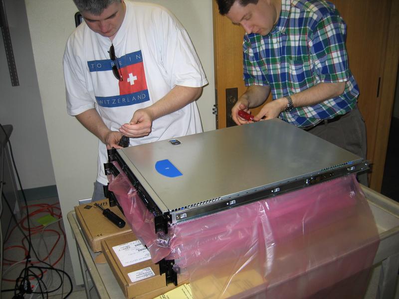 As the network was out when we came in on the morning of the 12th of May, we decided that our best course of action was manual labor. And so we mounted a full 24 systems in the main rack, plus two more racks to hold the machines we were working on before.