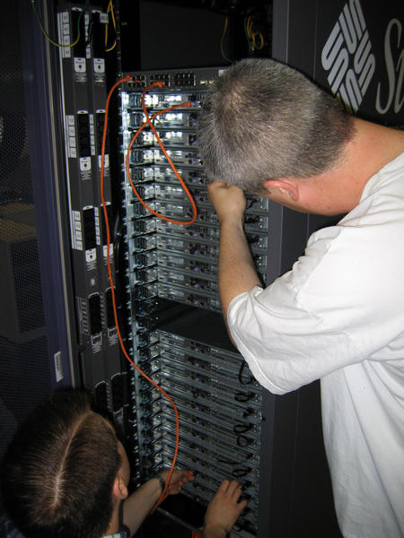 As the network was out when we came in on the morning of the 12th of May, we decided that our best course of action was manual labor. And so we mounted a full 24 systems in the main rack, plus two more racks to hold the machines we were working on before.