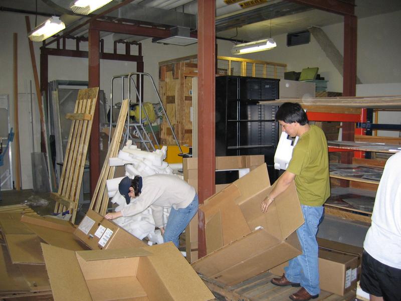 While we were out of space to continue working on clusters up in our primary work space after Day Six or so, we still wanted to get the last cluster ready to go ASAP. To help with this, we called in the help of several grad students (Eduardo, Amy, and Zhu) to assemble the cluster in the basement.