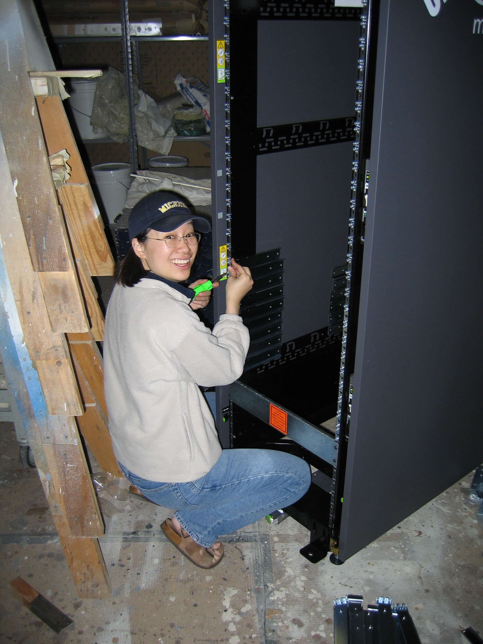 While we were out of space to continue working on clusters up in our primary work space after Day Six or so, we still wanted to get the last cluster ready to go ASAP. To help with this, we called in the help of several grad students (Eduardo, Amy, and Zhu) to assemble the cluster in the basement.