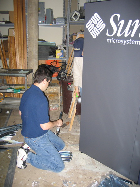 While we were out of space to continue working on clusters up in our primary work space after Day Six or so, we still wanted to get the last cluster ready to go ASAP. To help with this, we called in the help of several grad students (Eduardo, Amy, and Zhu) to assemble the cluster in the basement.