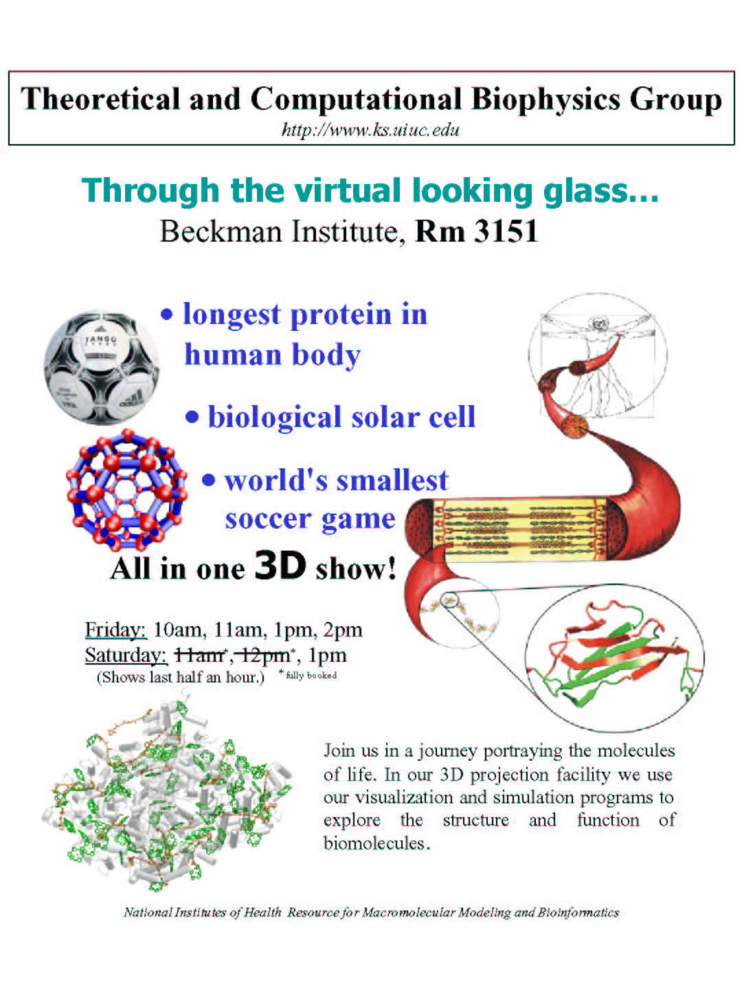On March 14th and 15th, 2003, the Beckman Institute for Advanced Science and Technology held an open house in conjunction with the College of Engineering at the University of Illinois at Urbana-Champaign. The Theoretical and Comptational Biophysics group presented a show entitled "Through the virtual looking glass" a journey portraying molecules of life in our 3D facility. (174 people visited our show.)