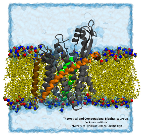 The protein conducting channel SecYEβ shown in a lipid membrane surrounded by water.