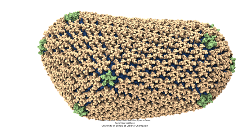 All-atom HIV-1 capsid with different color representations for pentamers and hexamers.