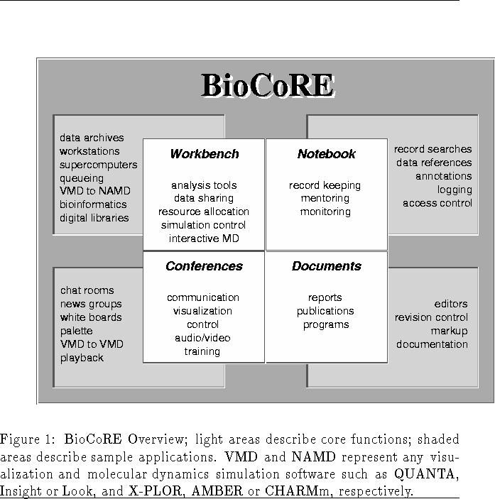BioCoRE will be accessible via a Java-enabled web browser. The user will log into the system via a browser and will be presented with a menu containing all projects for which access is authorized. The user will then select a project, which is created and stored in a BioCoRE collaboratory server at a selected web site. At this point the user has access to the main BioCoRE user environment, summarized in Figure 1, which supports four main types of user activities: