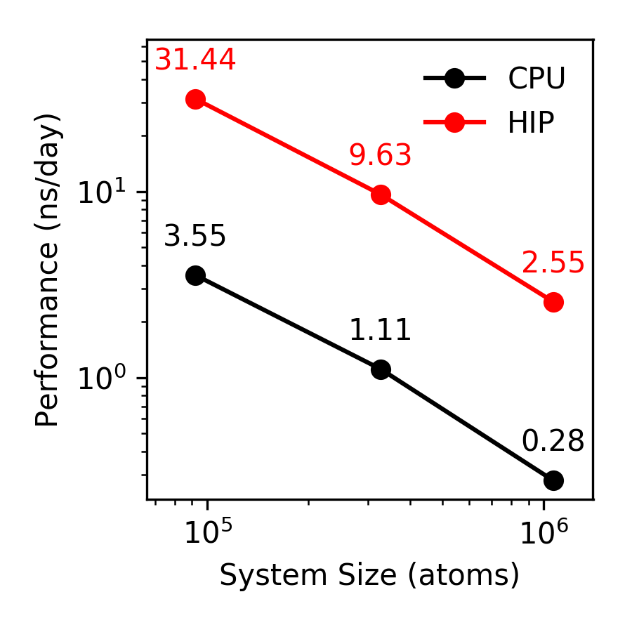 This alpha NAMD 2.15 build for AMD HIP/ROCm GPUs can speed up simulations up to 10 times on Radeon VII PRO when compared with CPU-only simulations using a PCIe 3.X motherboard. Further acceleration is possible on modern Radeon Instinct GPU cards paired with faster CPU-GPU interfaces, such as PCIe 4.X. The alpha also represents the first time that NAMD can utilize AMD GPU hardware to accelerate simulations.
