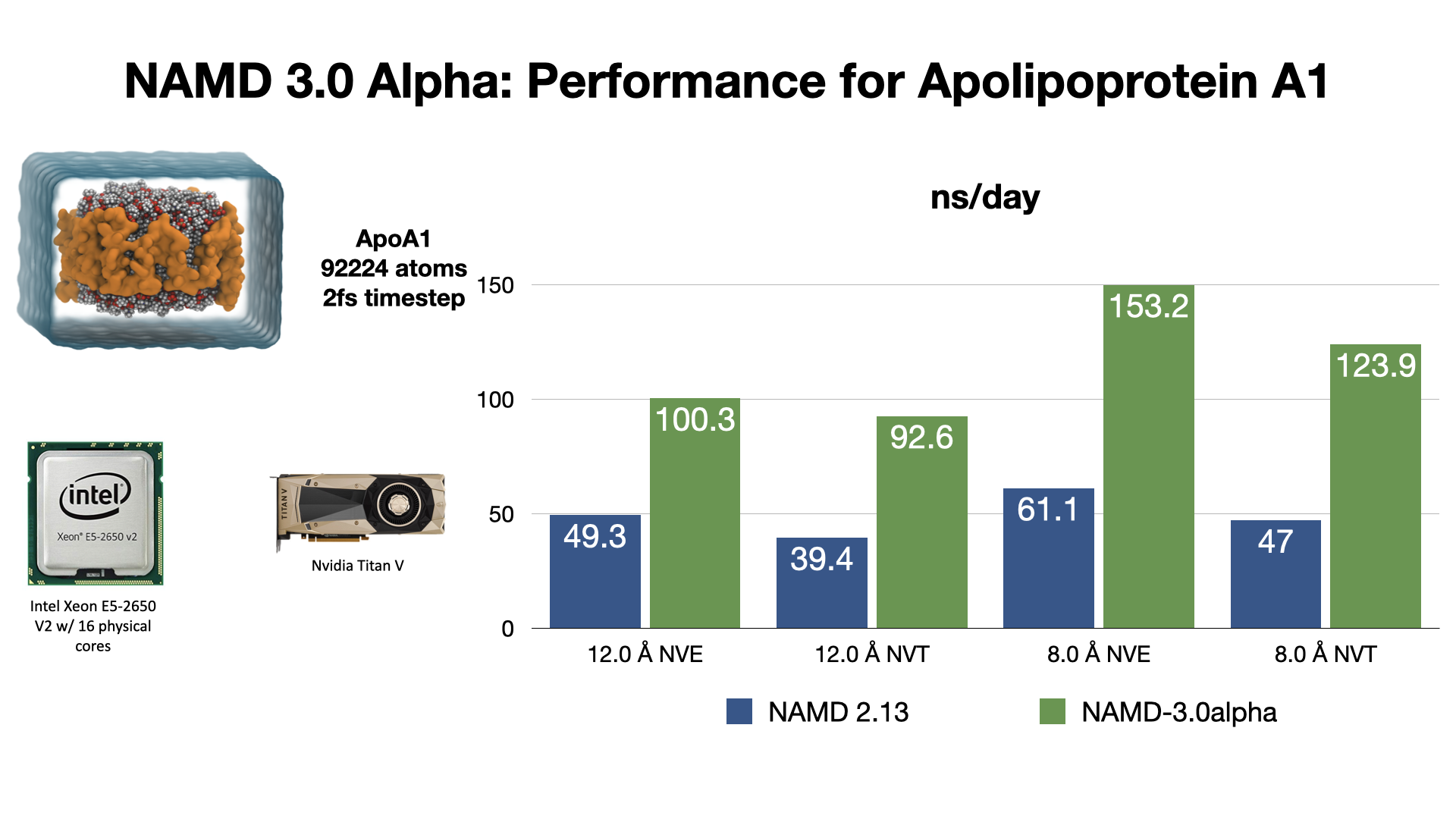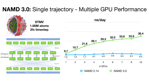 An exciting NAMD 3.0 feature being developed is a GPU-resident single-node-per-replicate computation mode that can speed up simulations up to two or more times for modern GPU architectures, e.g., Volta, Turing, Ampere.