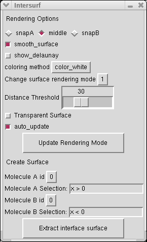 Define groups of atoms by their molecule ids and a "VMD selection". Then just press "Extract interface surface". Using "all" as selection will give an interface between the two molecules (A and B), and using the same molecule id with differant selection ("resid < 5" and "resid > 4" for example) will give an interface inside the molecule.