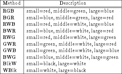 Several of the coloring methods, including `Beta', `Charge', and `Occupancy', describe a range of floating point values rather than a set of names. These are colored via the color scale, which is a list of 32 smoothly changing colors. There are many color gradations available. All of them consist of transformations of three colors. For instance, ``RGB'' colors the smallest value red, values near the middle of the scale are green, and the largest values are blue. Colors in-between are linear mixes of the two colors. The list of available gradations is given below.