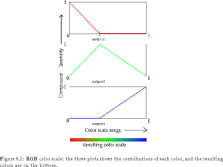 The minimum of the range of values is linearly scaled and shifted to start at 0 and end at 1. Assume the color scale is RGB. For a given value of x in the scale range [0..1], the RGB value is found first from a linear scaling based on the midpoint. If x = 0, R is 1 (for maximum red). This continues linearly until x = midpoint, at which point, R is 0 and stays 0. The green component is 0 at both x = 0 and x = 1 and is 1 at the midpoint. Linear scaling occurs in between. The blue component is 0 for x <= midpoint, and 1 for x = 1.