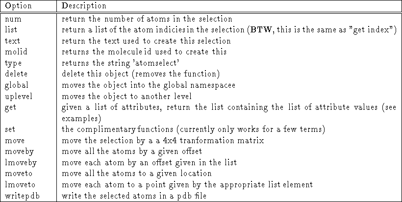 These derived object functions (the ones with names like atomselect3) take many options. They are listed in Table 14.2.