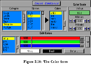To see the names associated with a color category, click on the category in the Category browser located on the left side of the form. Click on the name to see the color to which it is mapped. To change the mapping, click on a new color in the browser to the right of the Category browser. For instance, to change the background to white, pick `Display' in the left browser and `Background' in the center one. The right browser will indicate the current color (which is initially black for the background). Scroll through the right browser and select white to change the background.